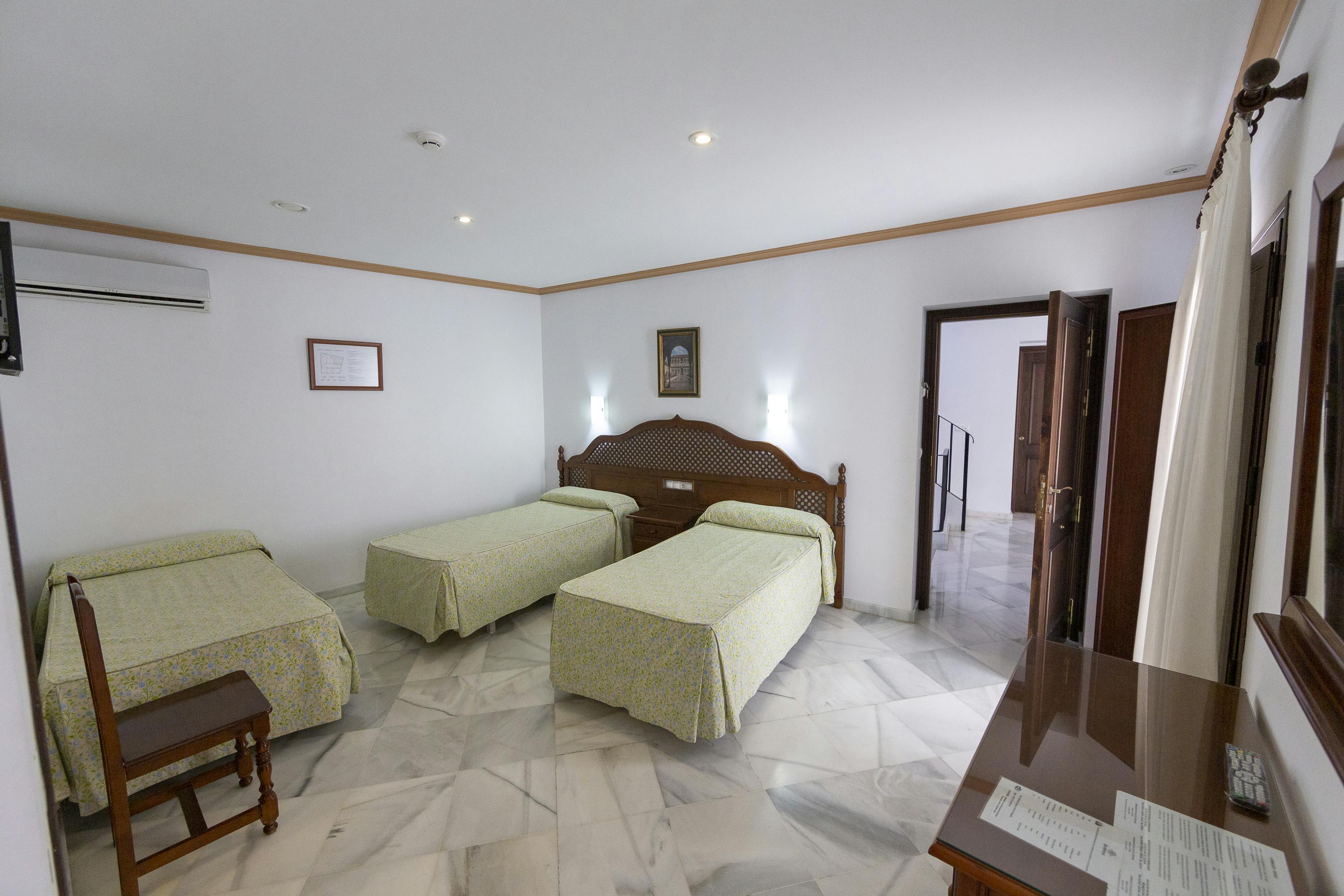 Disfrute de nuestras habitaciones triples, ideales para viajes familiares o con amigos. Disponen de tres camas o Cama doble + cama individual y todas las comodidades necesarias: baño propio, aire acondicionado, TV, Wi-Fi y calefacción.